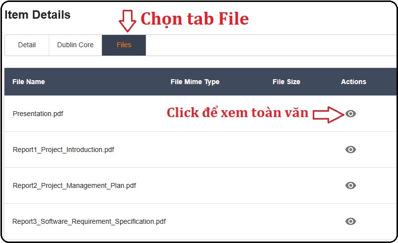 Sau khi tìm được tài liệu phù hợp, trong mục Item Details, Bạn đọc chọn tab Files và chọn biểu tượng view để xem toàn văn.