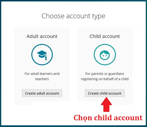 Tại giao diện Choose account type, Bạn đọc BẮT BUỘC PHẢI CHỌN LOẠI TÀI KHOẢN CHILD ACCOUND